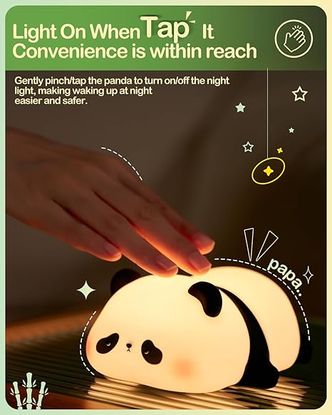 - Touch control: The light can be turned on, off, or have its brightness adjusted by simply tapping, touching, or kneading the panda's silicone body.