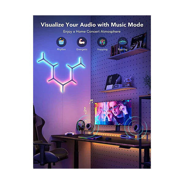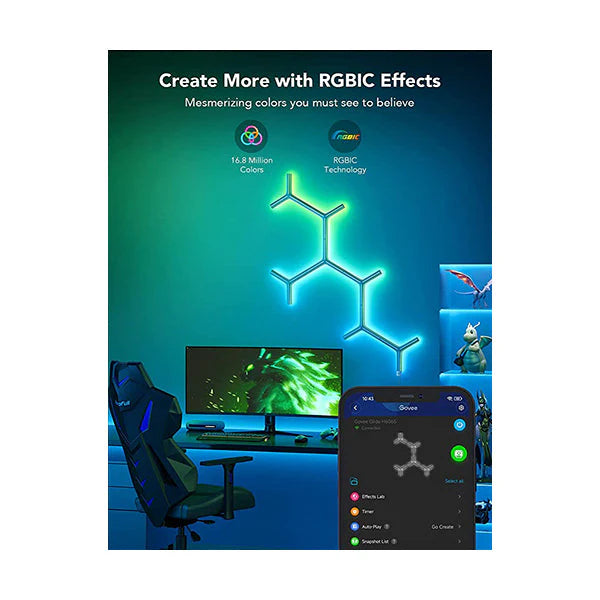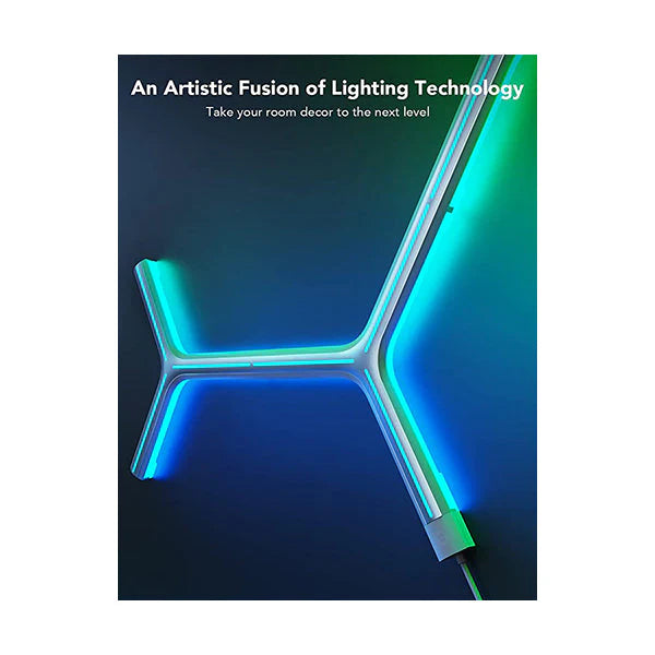 Model: H6065 Transform your living space with this striking set of Y-lights that craft stunning metallic light displays. Designed to enhance your walls with artistic elegance, it offers RGBIC technology to tailor any mood you want. Enjoy complete freedom with 16.8 million colors in DIY mode and bring your environment to life by syncing lights to sound through 8 distinct music modes. Featuring over 40 scene modes, it adapts seamlessly to your bedroom ambiance. Control everything effortlessly via the smart app, including music effects, scene settings, and scheduling.