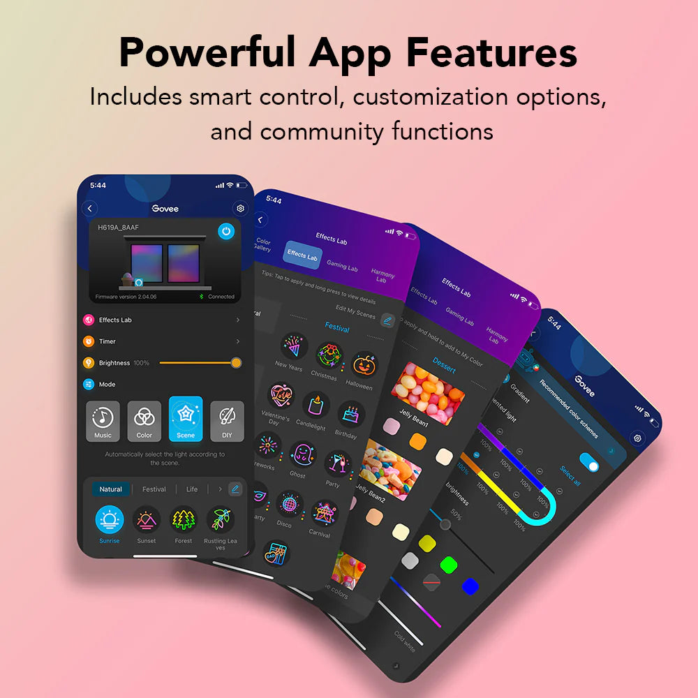 The Govee RGBIC LED Strip Light, model H6143, features a 5-meter (16.4-foot) length and operates at 12V with a current of 1.5A, delivering 18W of power. It is compatible with the Govee Smart App for advanced control and customization.