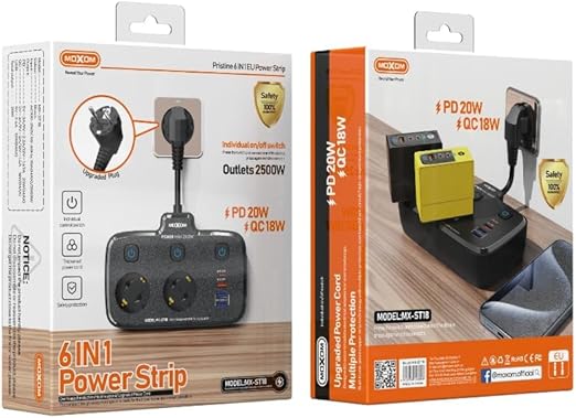 The Moxom MX-ST18 is a sleek black power strip featuring two AC outlets and six USB ports, designed to support a variety of devices with universal plug compatibility. Crafted from durable plastic and rubber, it offers built-in surge protection to ensure safety for your equipment. Its smartly spaced outlets accommodate larger adapters without crowding, making it suitable for home offices, entertainment systems, and computer setups. Lightweight and compact, this power strip is an efficient solution for managing multiple high-power devices simultaneously, whether at home, in the office, or on the go.