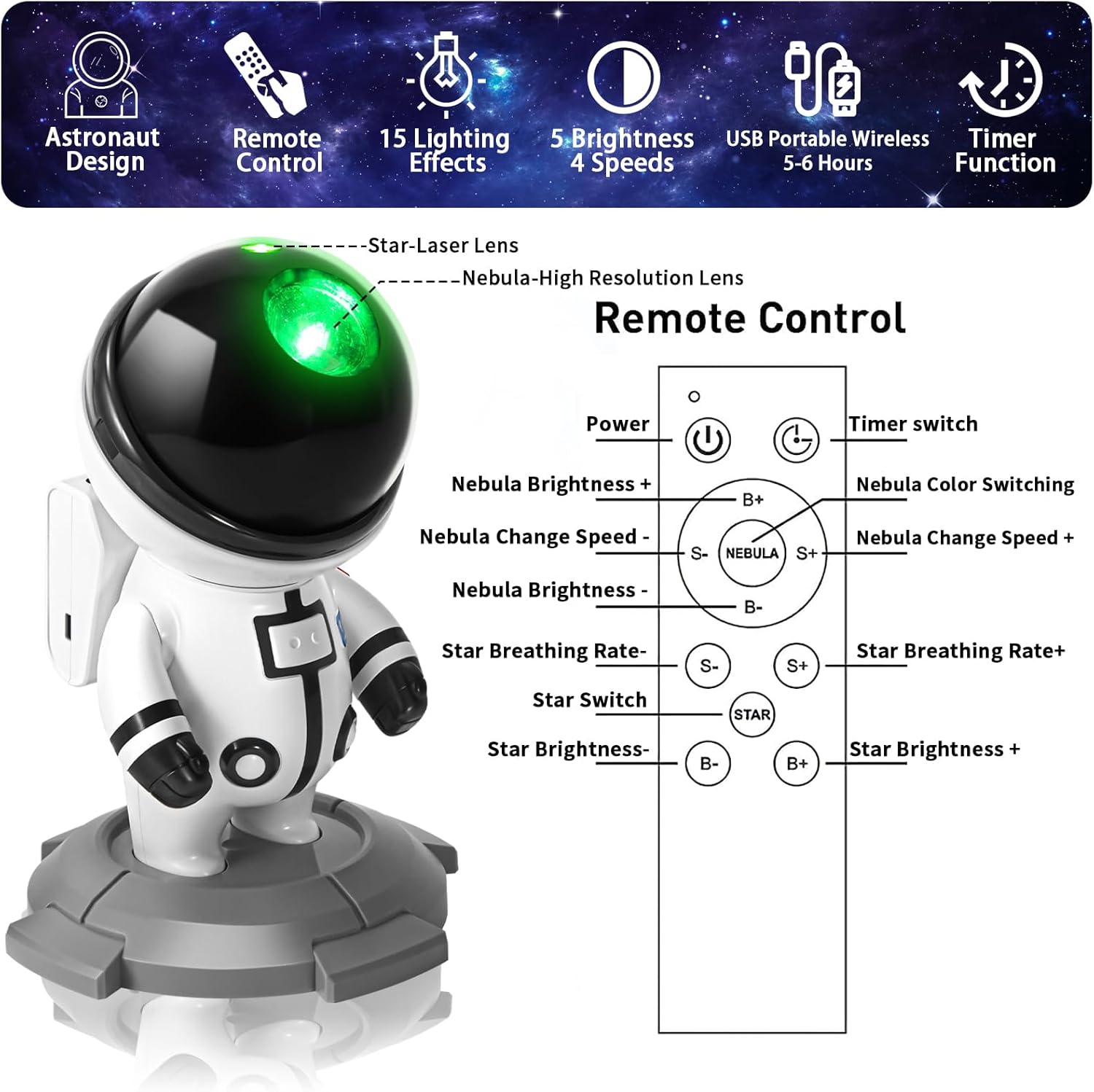 - Astronaut design: The unique design of a helmeted astronaut is a major selling point. The head is magnetically attached and can be rotated 360 degrees, allowing you to aim the projection in any direction.